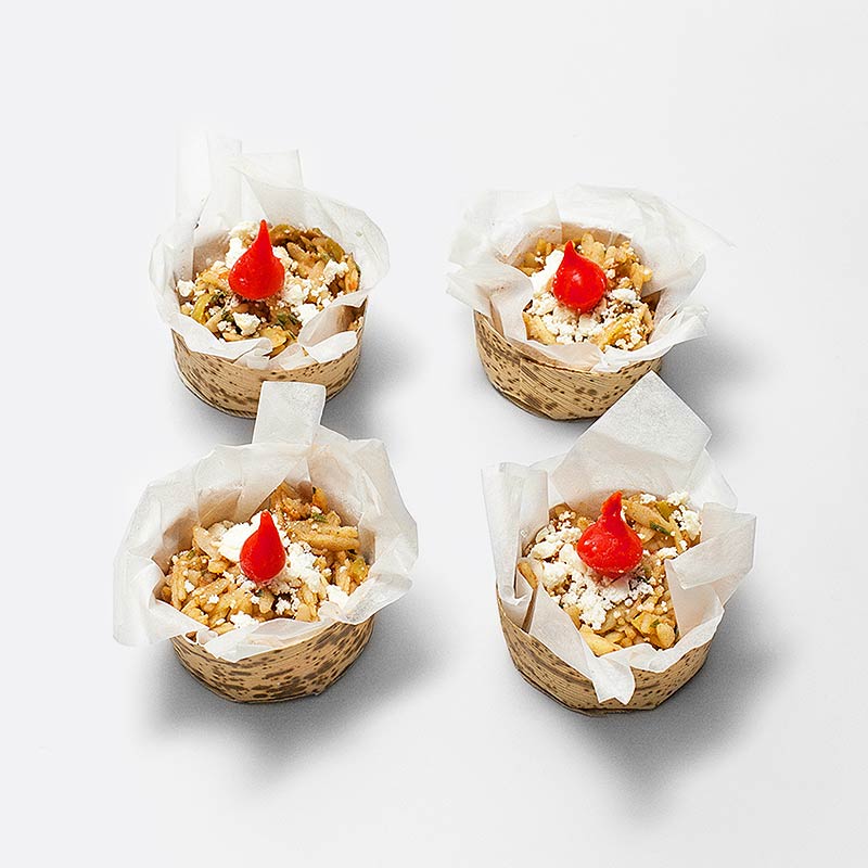 Vegetarische mini Poke Bowl mit Orzo Nudeln, Hirtenkäse, getrockneten Tomaten und Oliven